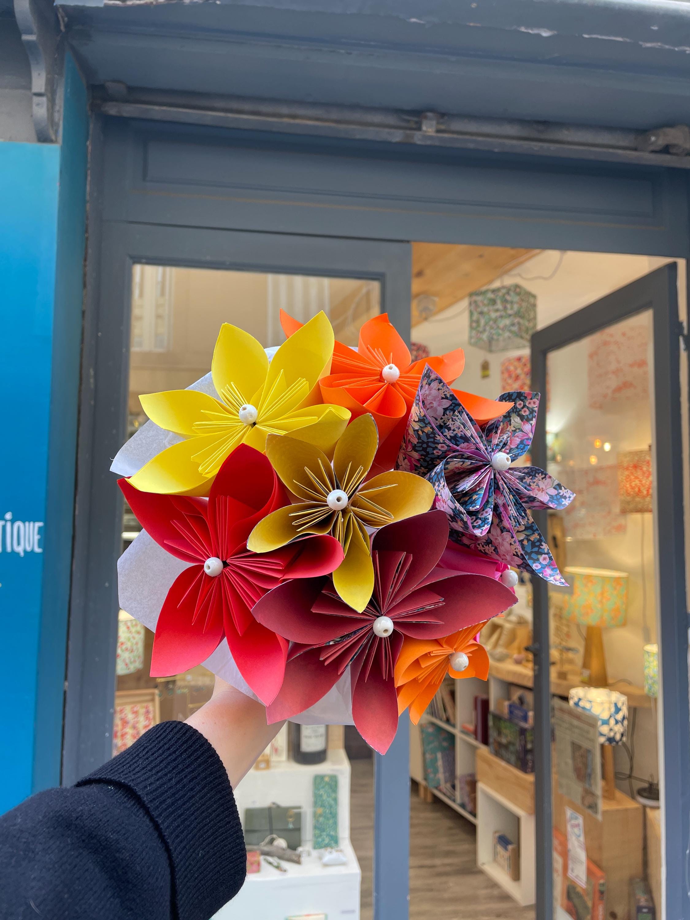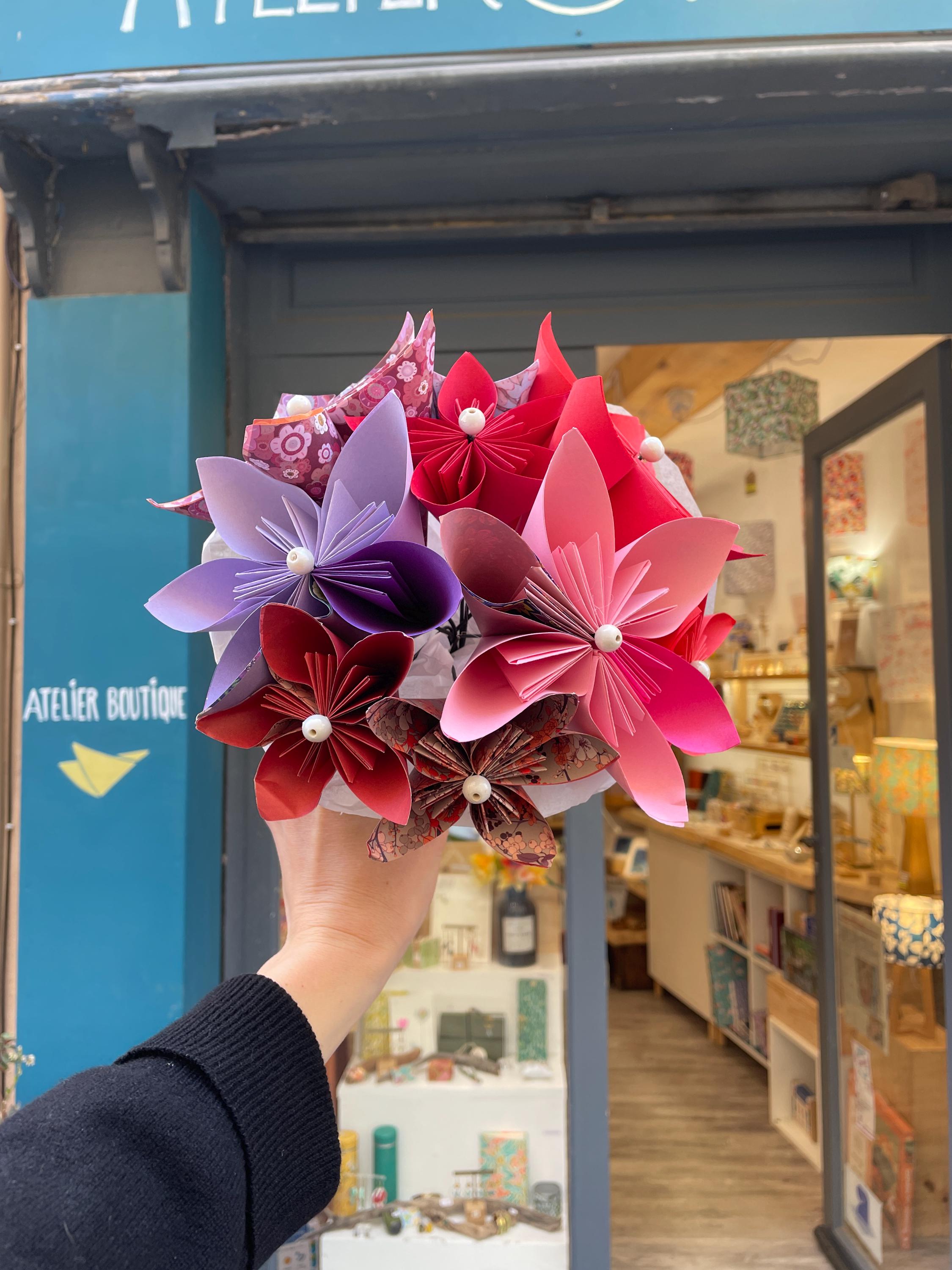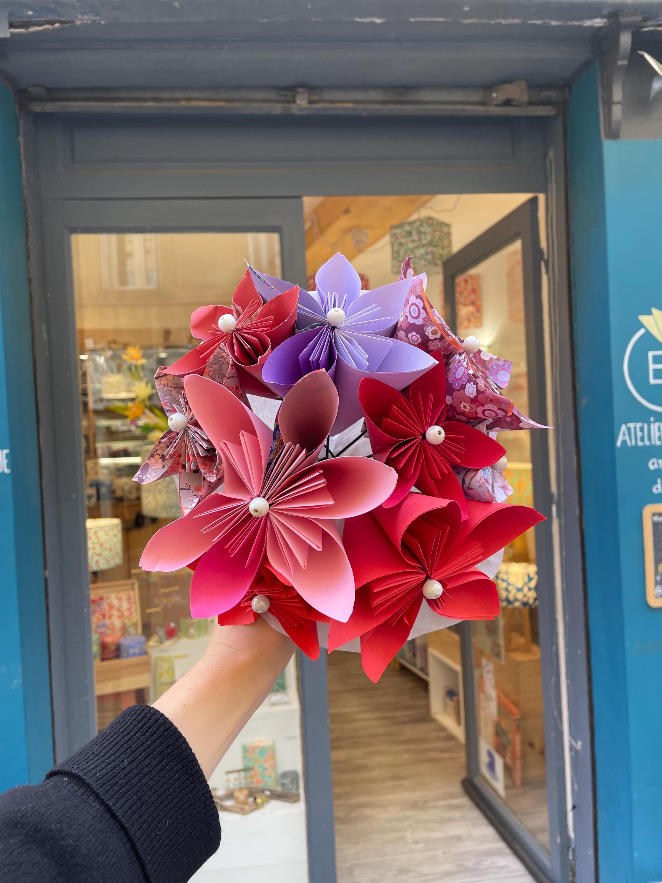 Decorative or bridal paper bouquet. This origami bouquet is everlasting. Flower petals made from paper using origami and folding techniques, rigid metal stems.