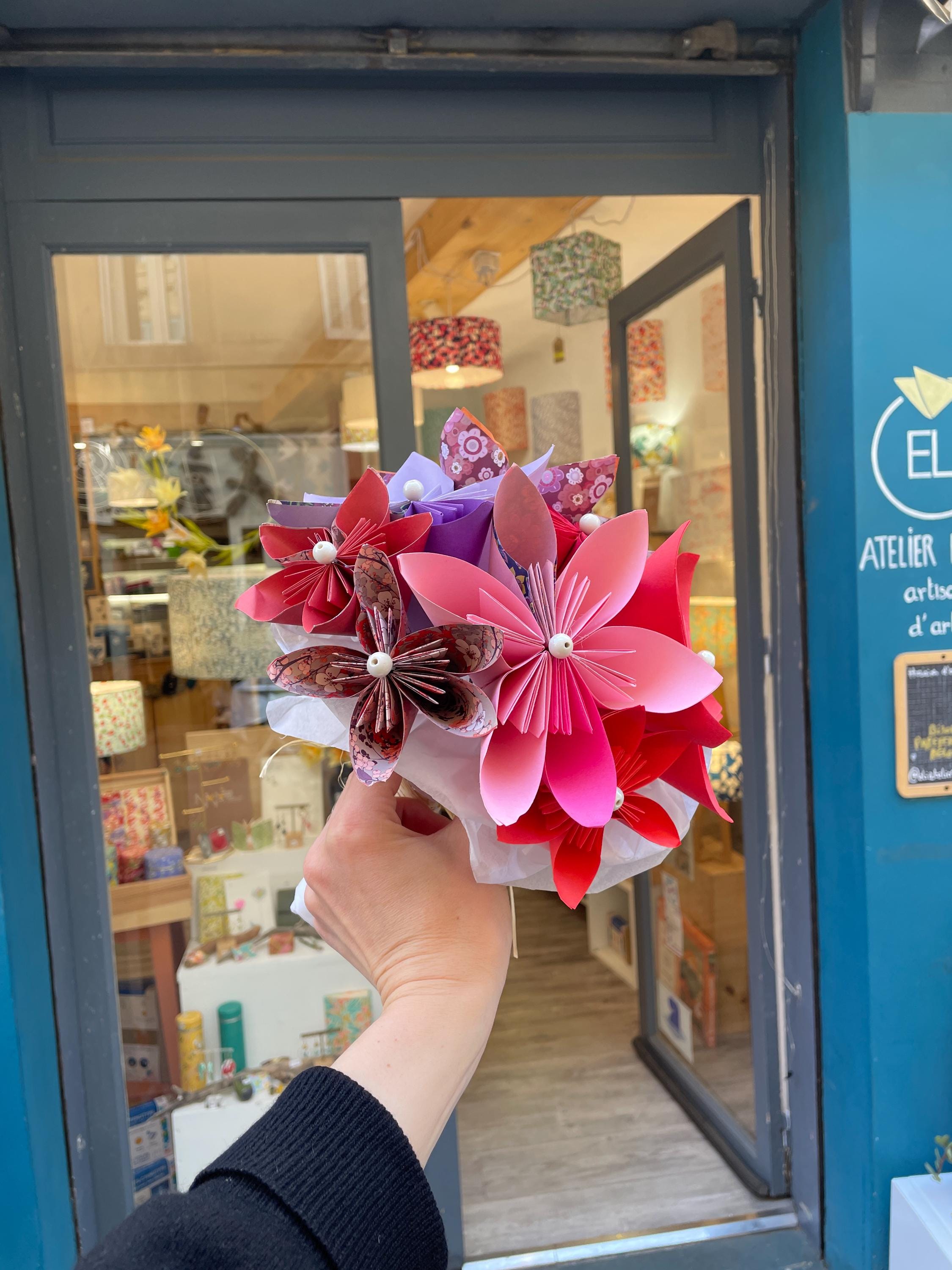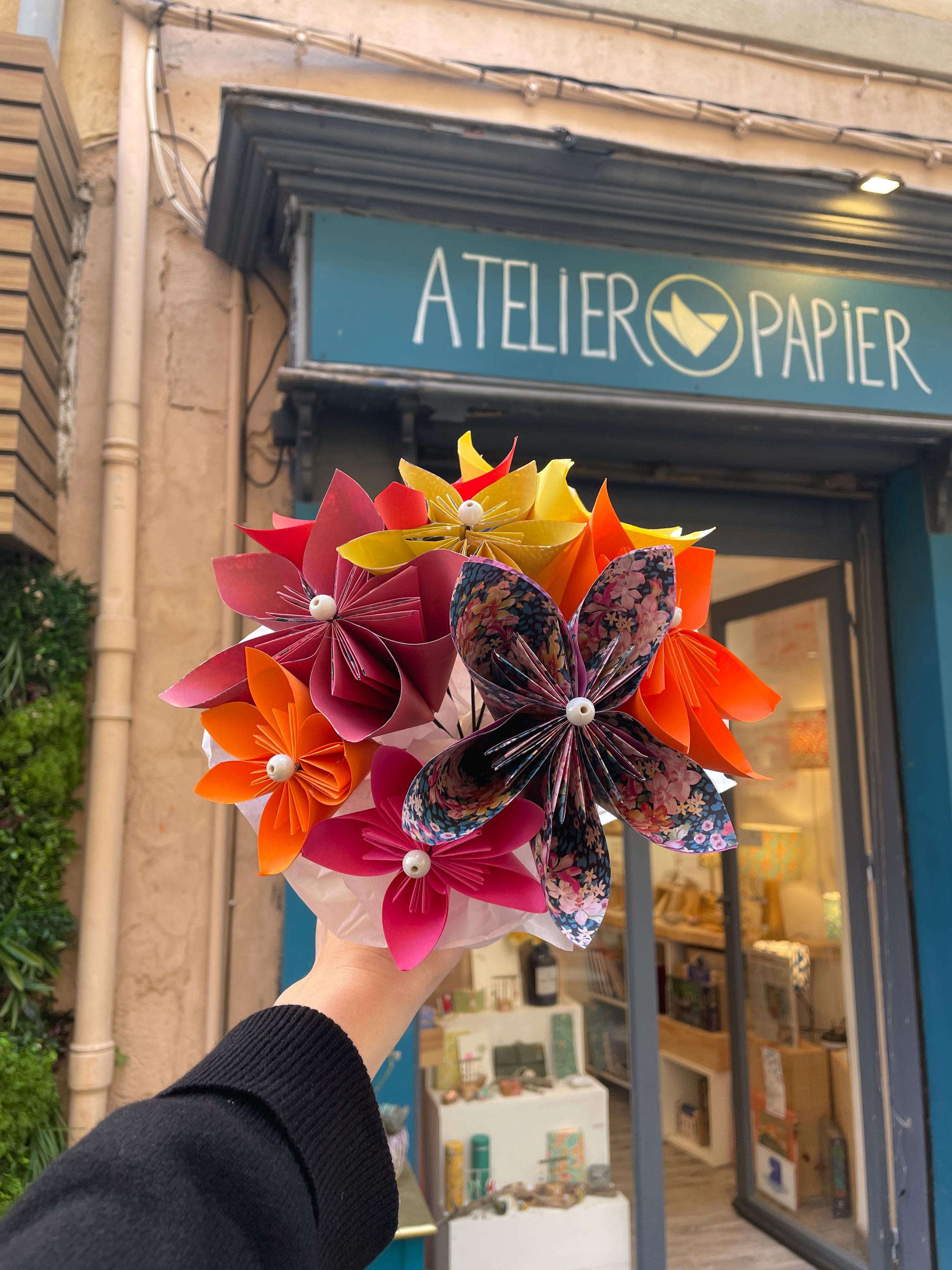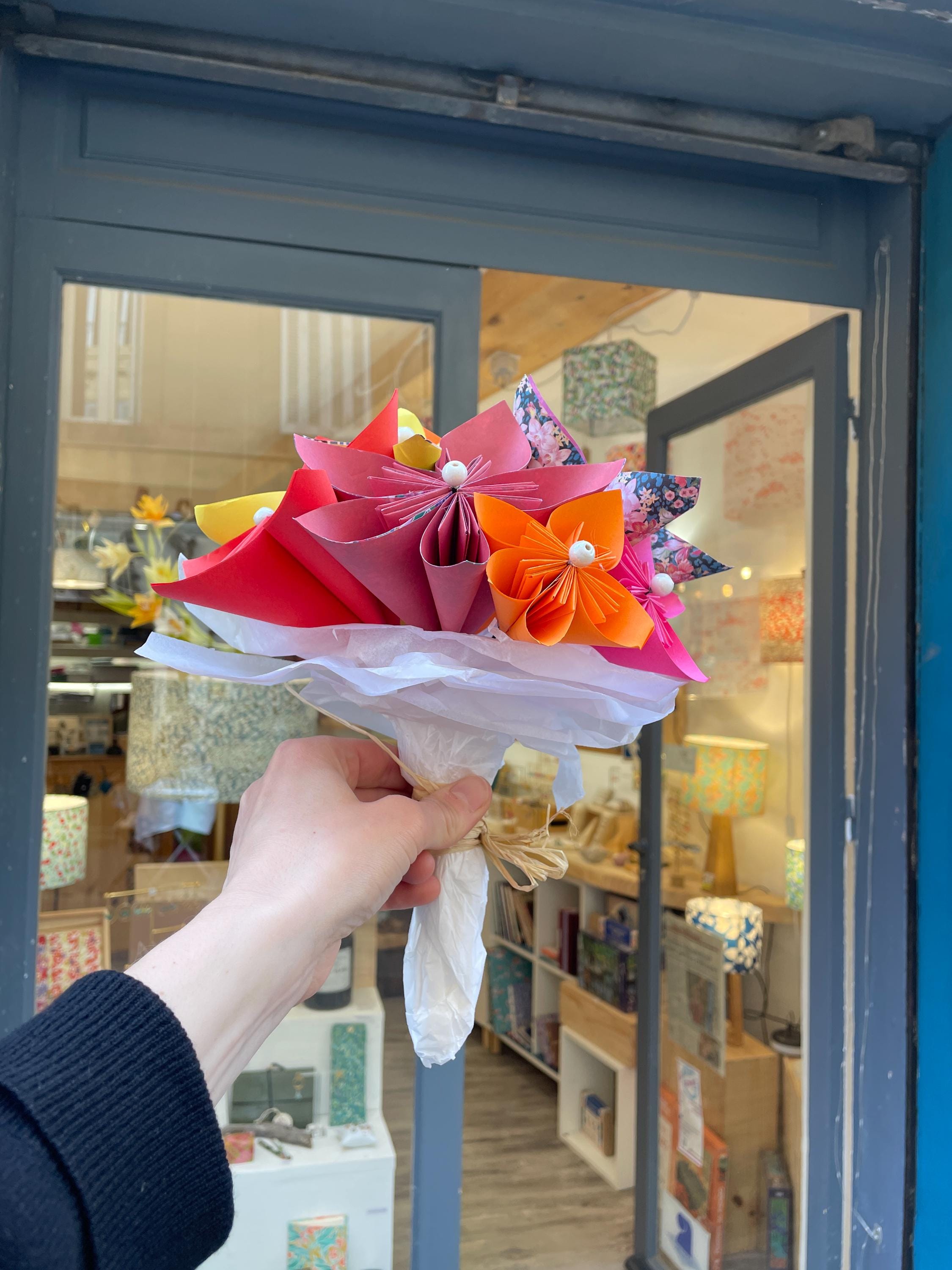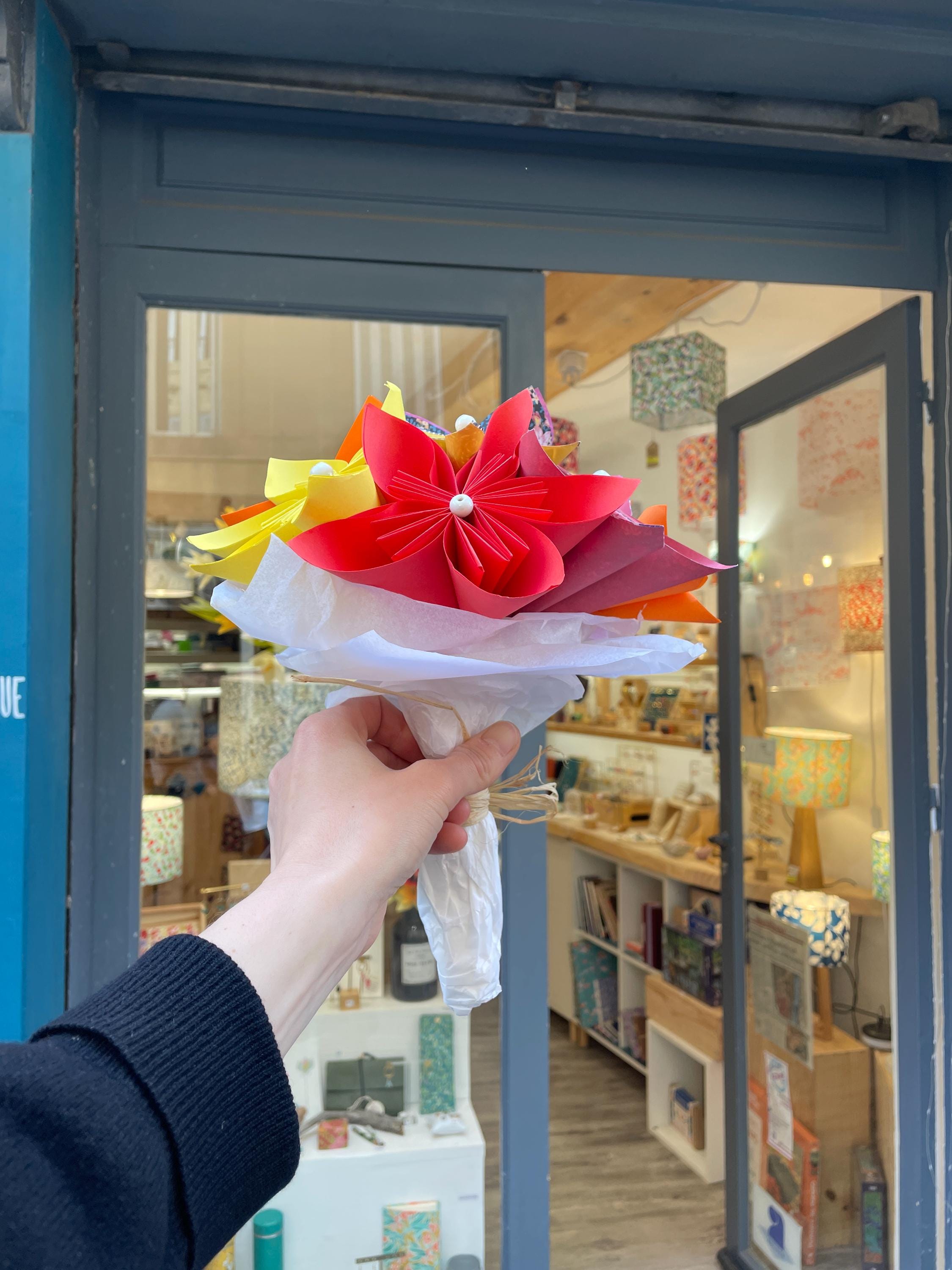 Decorative or bridal paper bouquet. This origami bouquet is everlasting. Flower petals made from paper using origami and folding techniques, rigid metal stems.