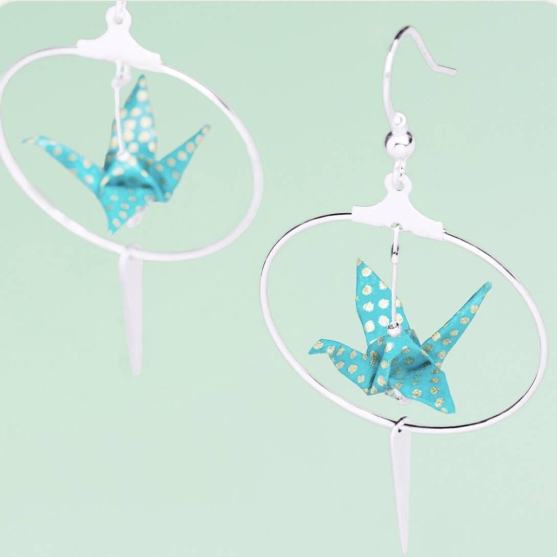 These origami paper jewels are light and stylish. The uniqueness of the handmade japanese origami crane folding in the hoop earring give a very airy and delicate aspect to the jewel that is well-suited for all occasions.